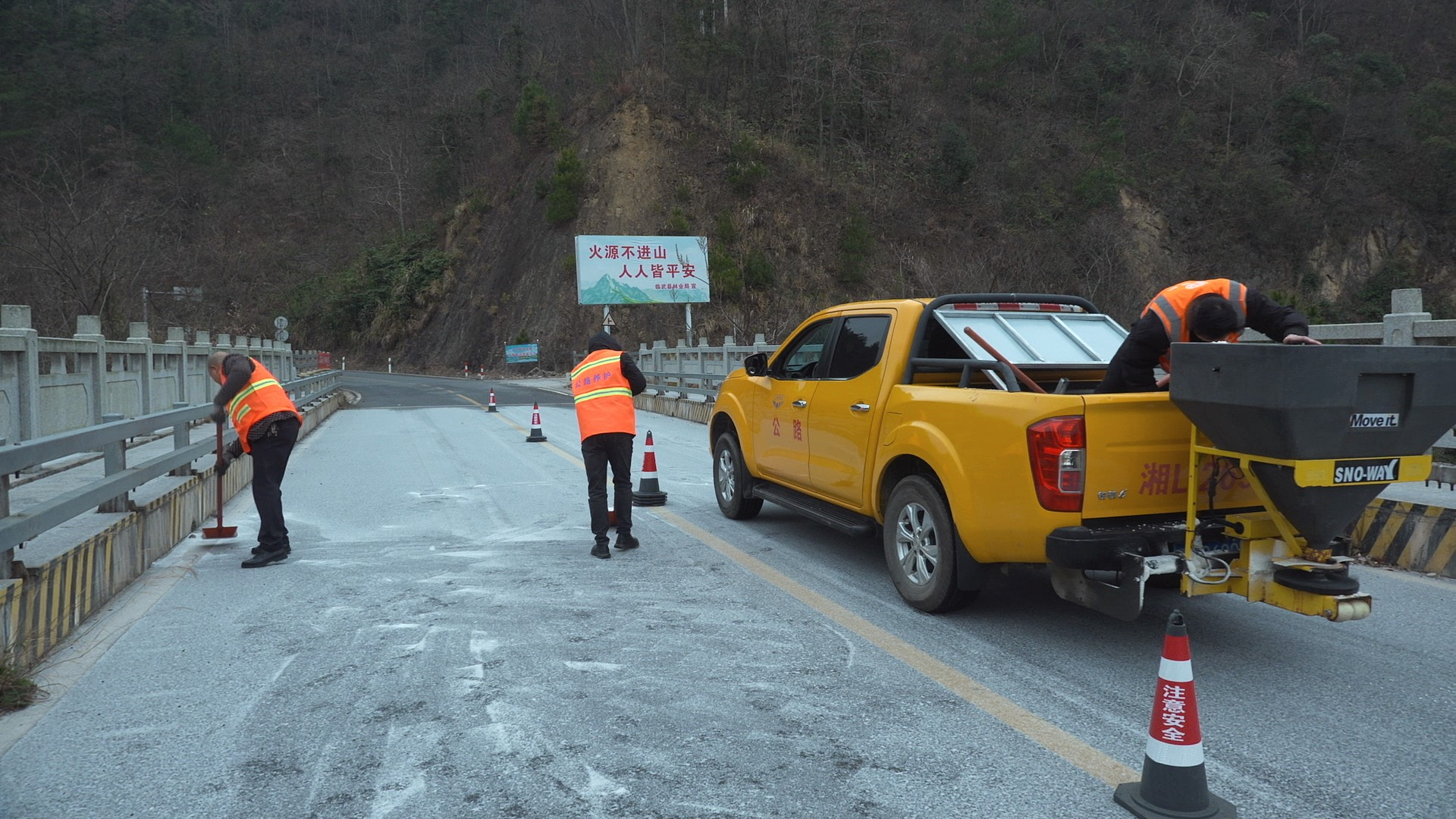 湖南高速公路集团有限公司郴州分公司临武管理所撒布融雪剂(临武县融媒体中心 供图)