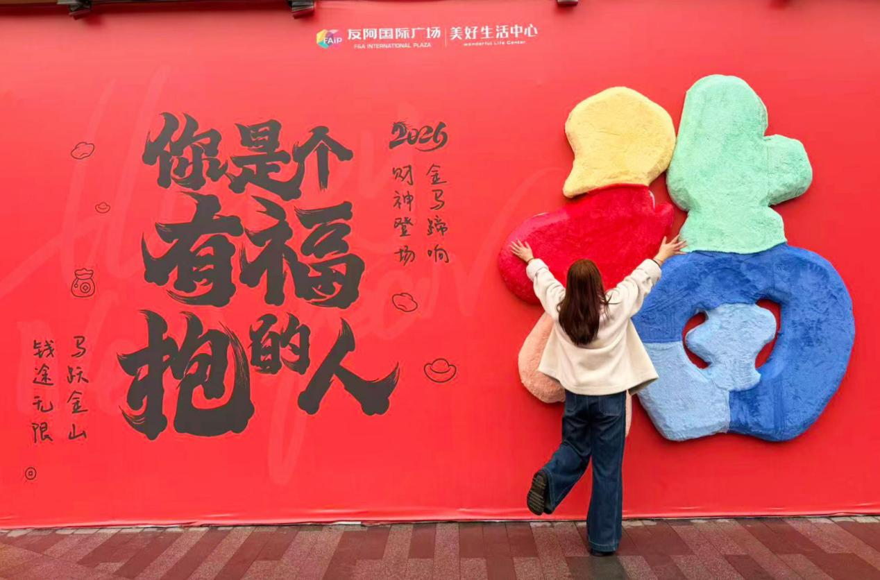友阿国际广场将新春景观营造与民生服务深度融合,让年味既有颜值更有温度。户外区域,商场沿街设置的巨型红色主题打卡墙人气十足,“你是个有福抱的人”暖心标语搭配雅致书法字体,立体福字装置色彩鲜亮,与“金马蹄响 财神登场”等新春祝语相得益彰,成为市民定格新春美好、传递新年福运的网红打卡点。
