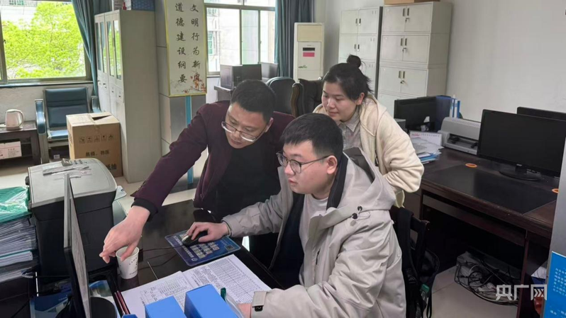 业务骨干曹久智正在指导刘宇飞审核就业补助资金申报材料(央广网发 张圣虎 摄)