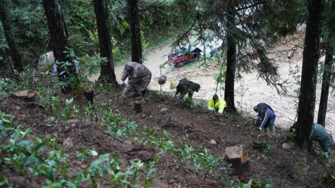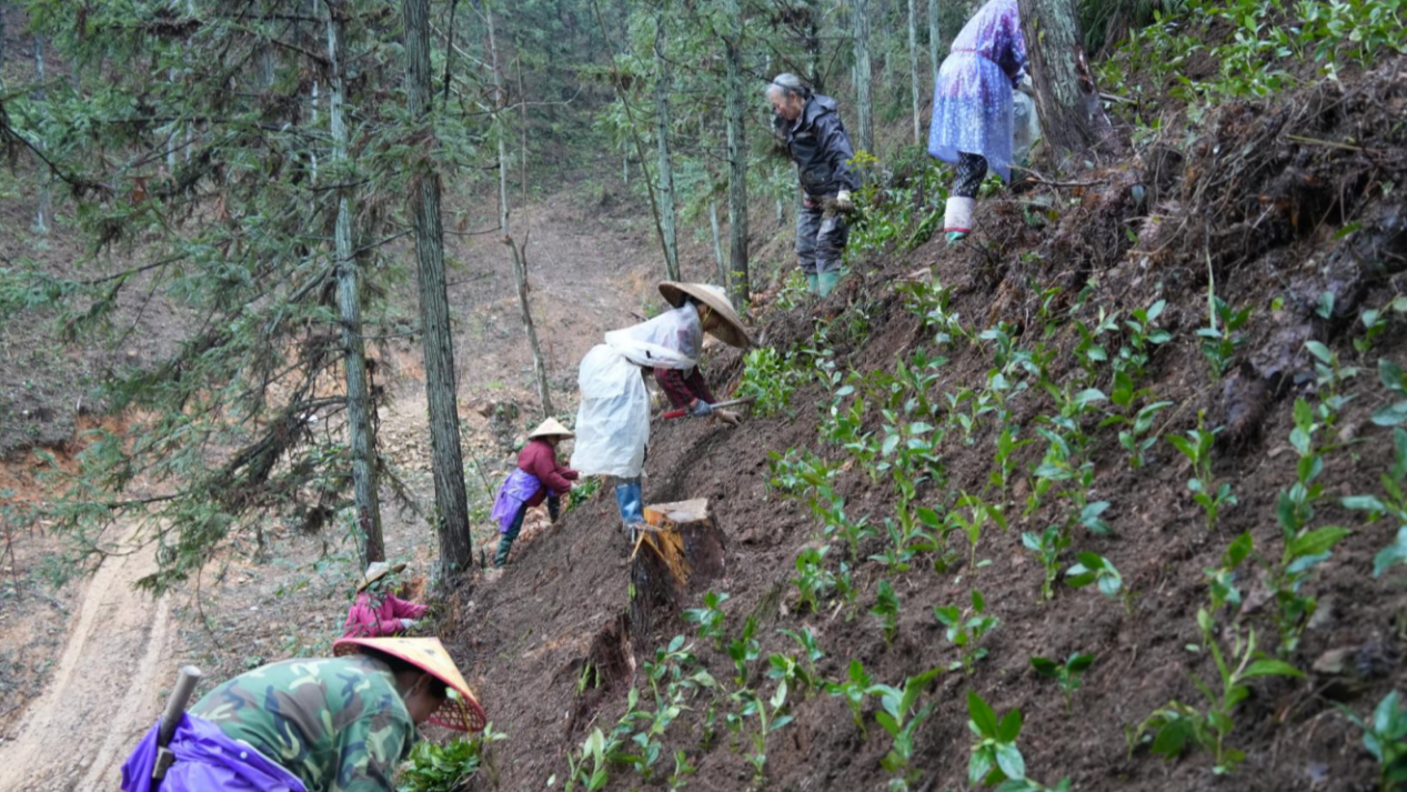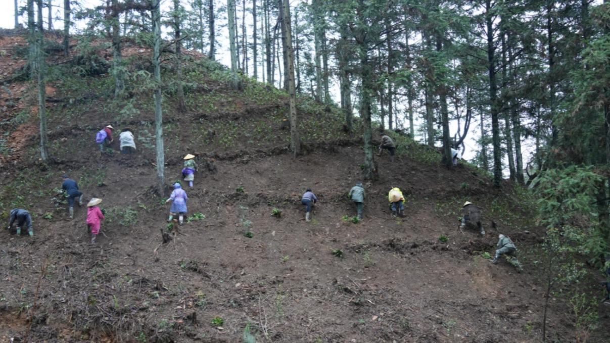 4月1日,在湖南省绥宁县乐安铺苗族侗族乡天堂村左家湾山地林间,不时传来村民的欢声笑语,大家在林间来回穿梭,挖土、栽苗,现场一片忙碌景象,成片的草珊瑚幼苗在树下整齐排列。