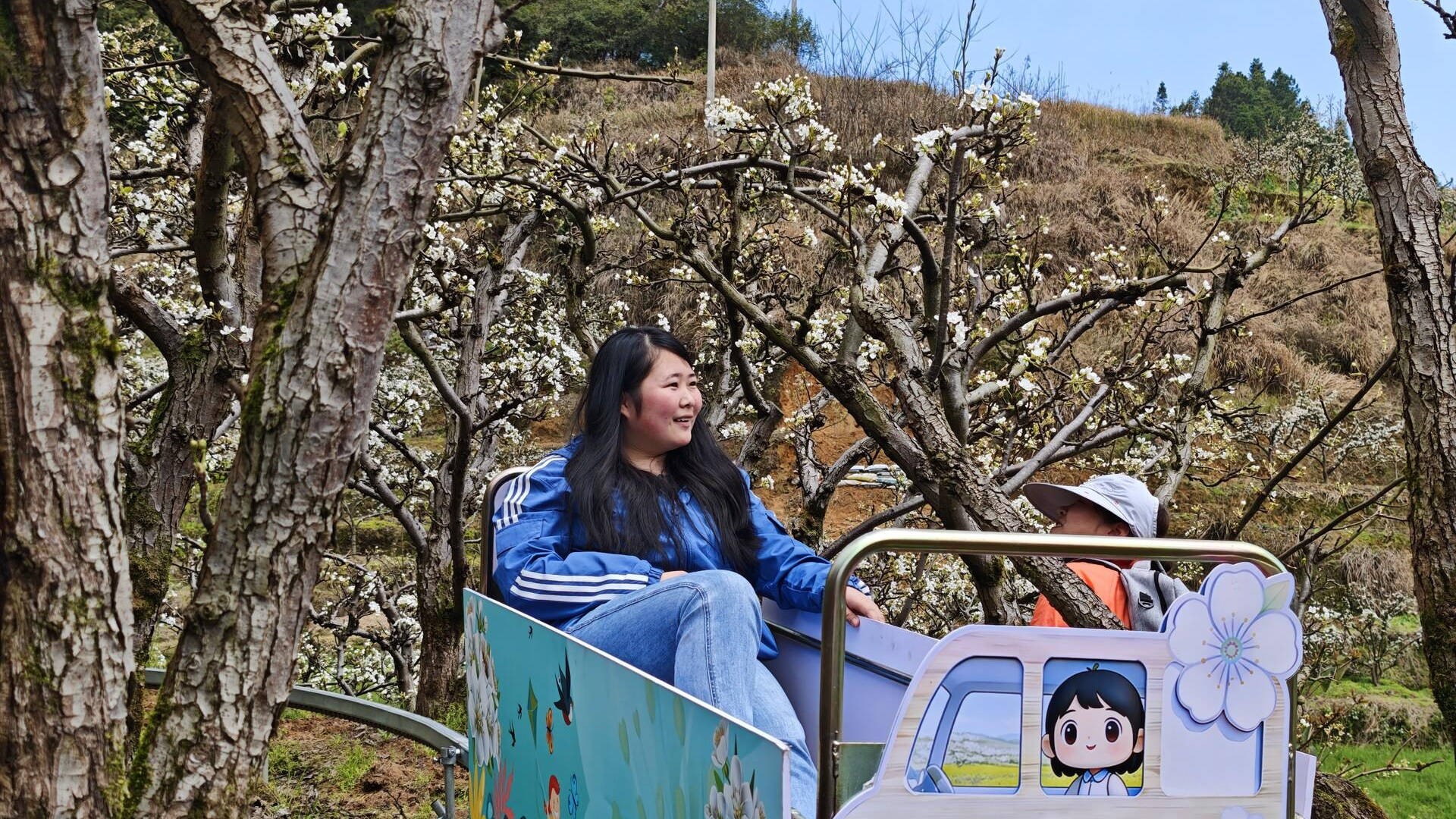 游客乘坐梨园小车赏花(中方县融媒体中心 供图)