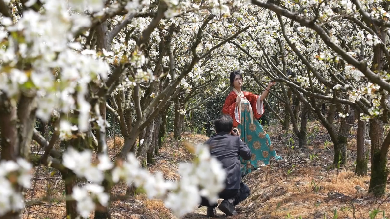 在核心观赏点位,铁坡镇免费提供汉服供游客体验,身着汉服的游人漫步花间,翩翩广袖与素洁梨花相映成景。游客们或在“你好,梨花周”打卡点拍照留念,或乘坐花海轻轨俯瞰梨园全景,沉浸式感受“雪海诗乡”的独特韵味。