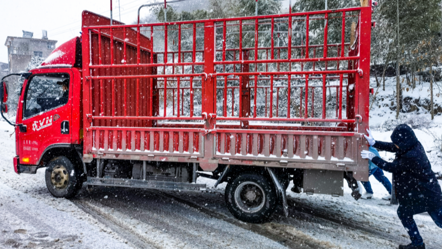 抗冰抢险现场,张巨鸣为受困车辆推车排险(城步公路建设养护中心 供图)