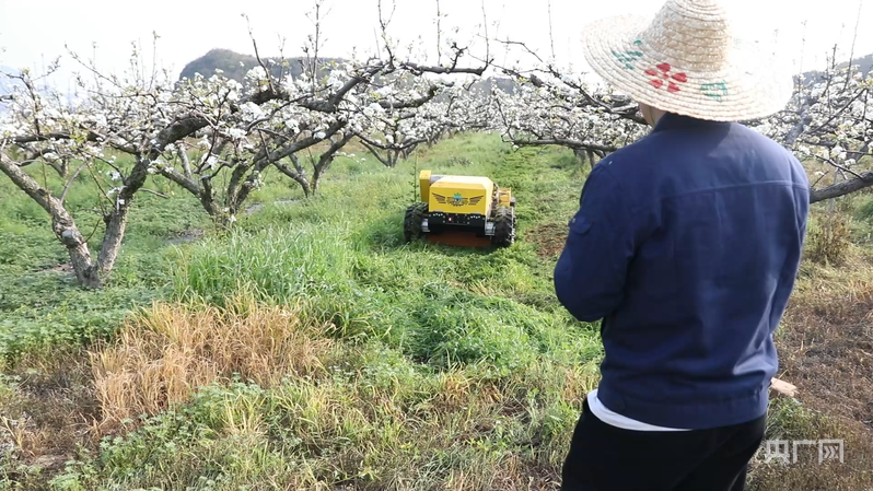 梨园的另一边,技术人员正遥控操作着两台除草机器人进行作业。只见它们灵活穿梭于果树行间,精准清除杂草,所过之处土地平整疏松。相比传统人工除草,机器人作业大幅提升了效率,同时避免了除草剂的使用,保障了果品的绿色生态。