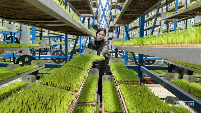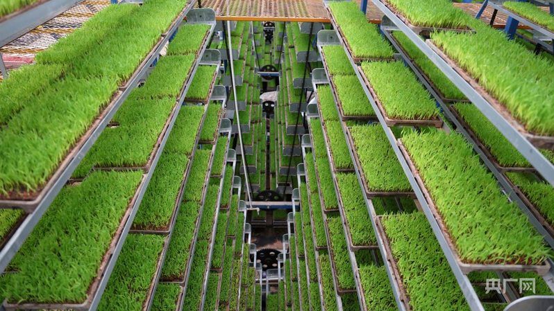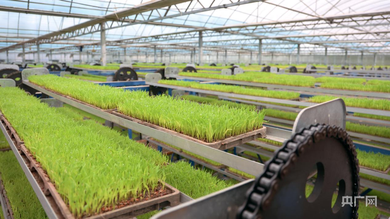 循环运动式育苗床上摆满了一盘盘嫩绿的秧苗(央广网发 廖晶 摄)