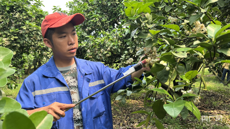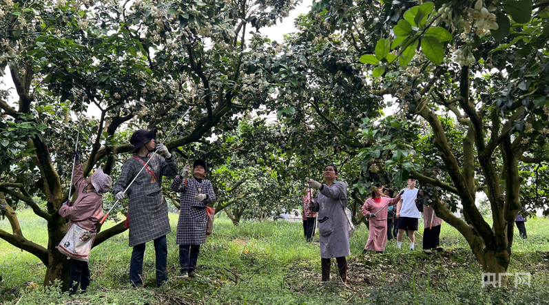 工人们在为香柚开展人工授粉(央广网发 谢文彬 摄)