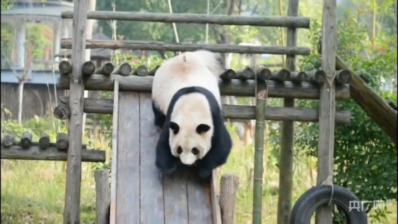 长沙生态动物园里,熊猫大美正在溜滑梯(央广网实习生 余旭雯摄)