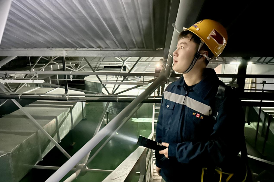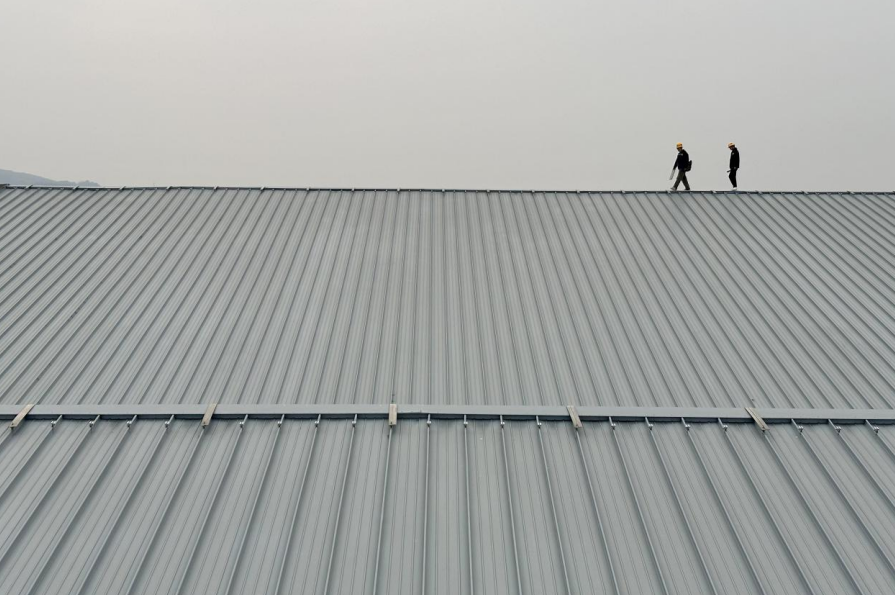 当天下午,朱翔和刘宏先爬上30米高的站房屋面检查。爬上屋面后,他们两人一前一后,左右查看,检查屋面天沟是否堵塞、屋面板有无起鼓、止风夹有无松动等。