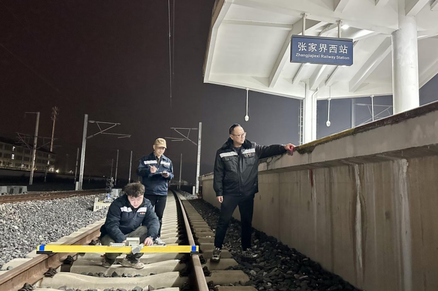 当天晚上11点,当最后一趟高铁列车开走后,站台安静下来,朱翔已和工区职工在张家界西站候车室集合。1月23日0点到4点,他们将利用“天窗”进行站台雨棚、限界测量。这意味着,他们又将经历一个不眠之夜。