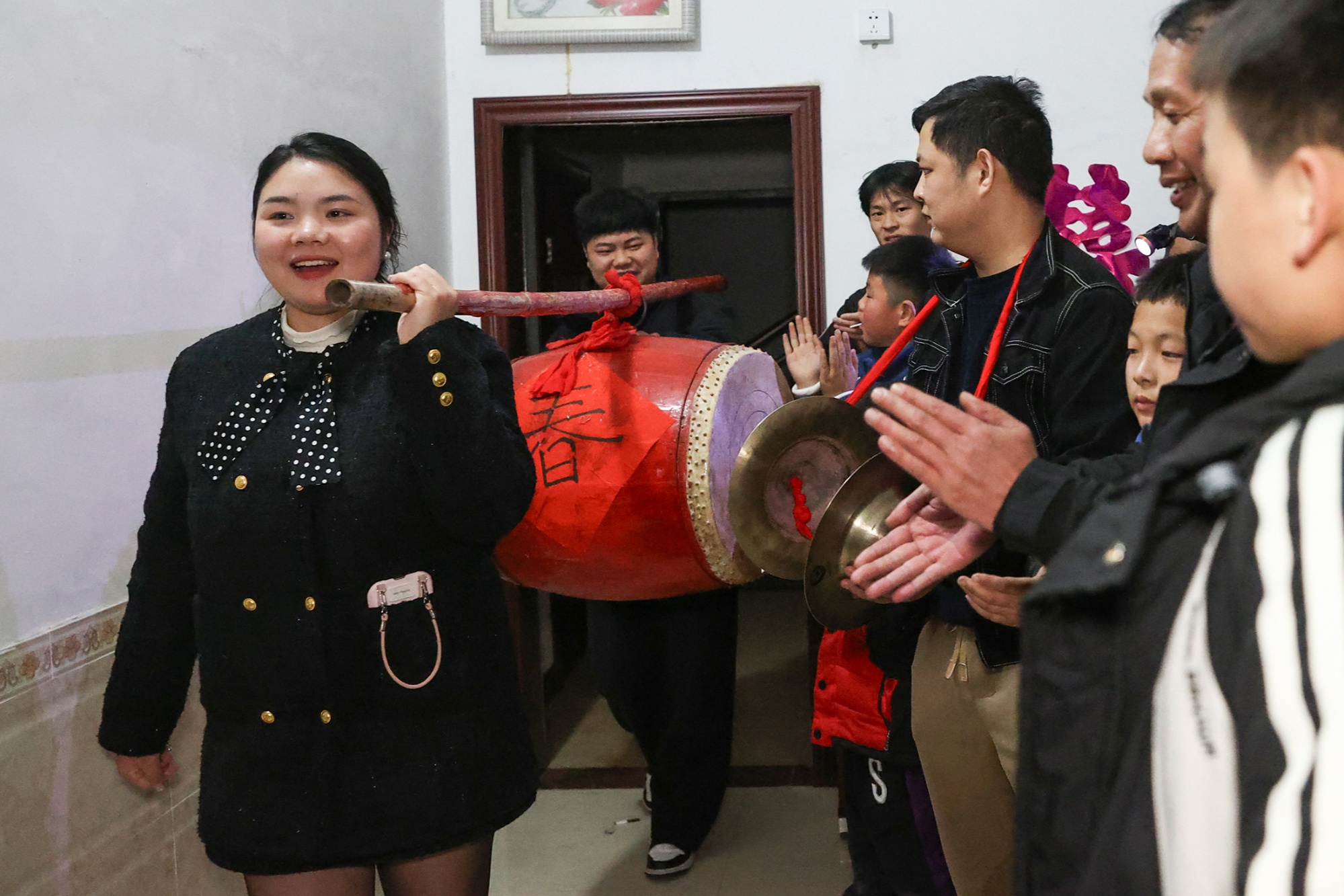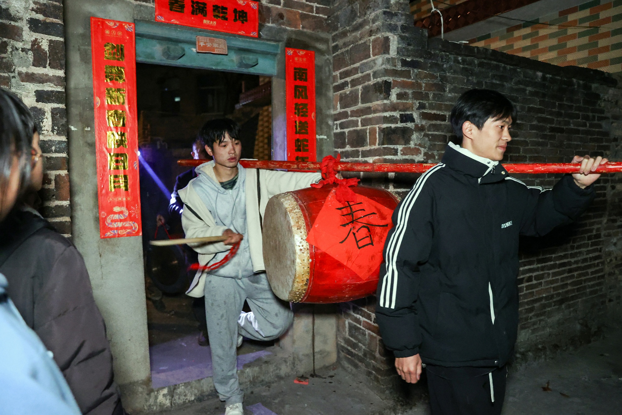 村中刚结婚不久的新人迎接“闹春鼓”,他俩将大鼓移交至另一对新人(陈卫平 摄)