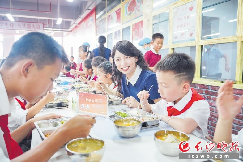 仰天湖实验学校的老师与孩子们一起用餐,倾听孩子们的建议。长沙晚报全媒体记者易亿 摄