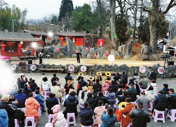 2月5日,崇木凼村村民在村晚舞台下手舞足蹈,与台上的演员互动。均为湖南日报全媒体记者童迪 陈萌 摄