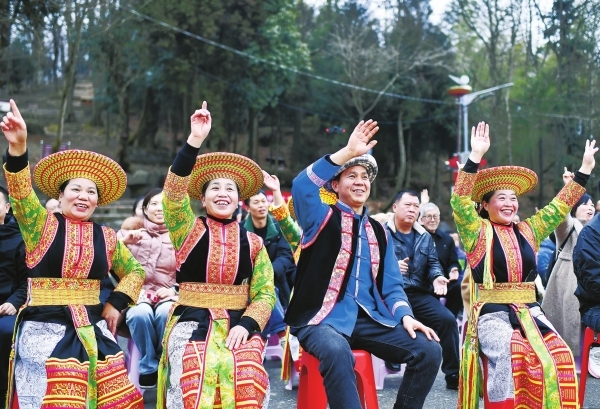 “哦——呜哇呜哇!”一声穿云裂石的山歌骤然响起。呜哇山歌的市级传承人陈治安带队登场,苍劲的歌声穿越时空,在古树林间回荡。紧接着,村里的瑶族阿妹们踏着欢快的鼓点翩翩起舞,《挑花裙》七彩的裙摆旋转成一幅流动的画卷。