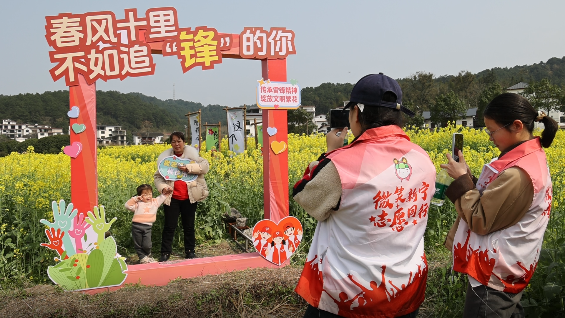 近日,湖南省新宁县崀山镇黄背村千亩油菜花竞相绽放,金黄花海连天,与一抹抹“志愿红”交相辉映,共同绘就“学雷锋、暖人心、助旅游”春日画卷。