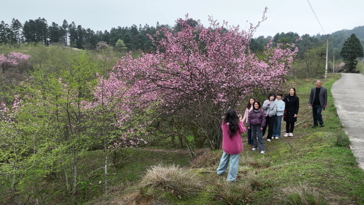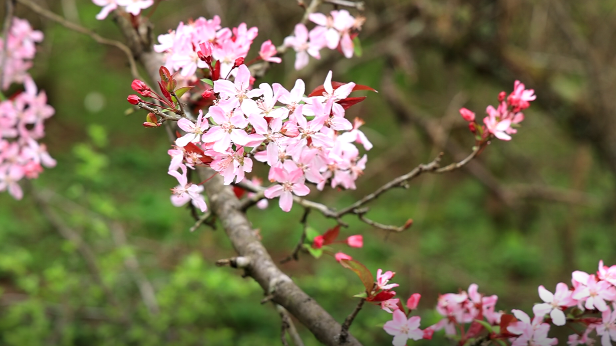步入九龙塘山林,野海棠、梨花、高山杜鹃漫山遍野竞相绽放,各色花卉错落交织,粉白相间、姹紫嫣红,与青翠山林相映成趣。层层花瓣包裹着露水,阵阵春风流泻着清香,游客跟随风讯花语漫步林间,辨认花种之余,纷纷打卡留念、定格盛景,沉浸式感受原生态山林的清新与静谧。