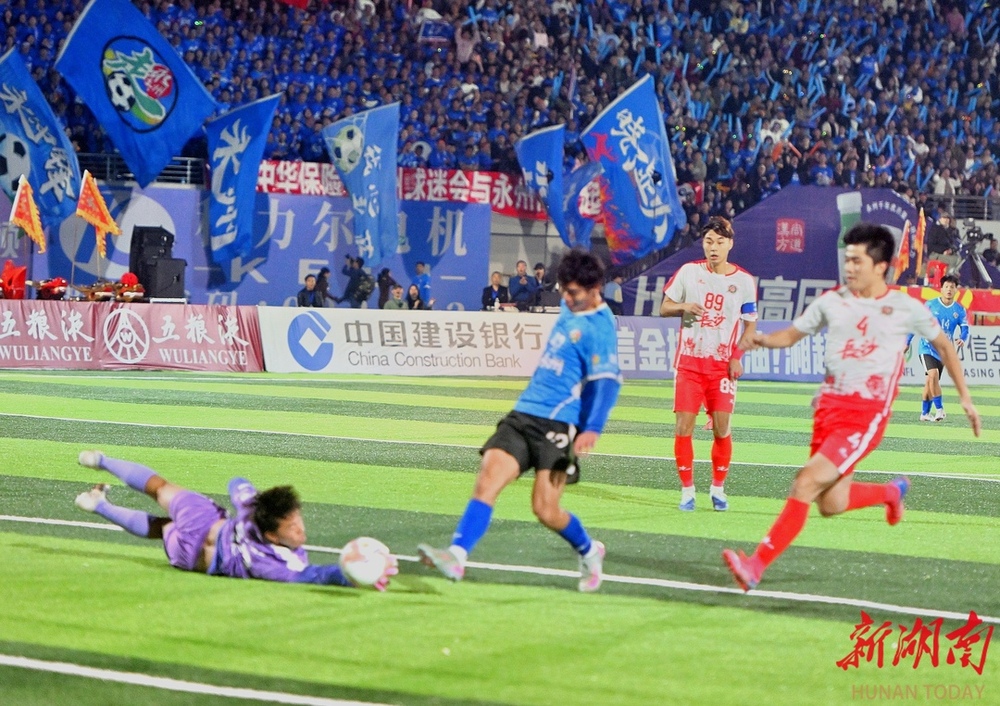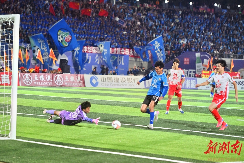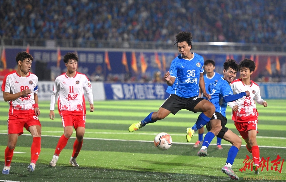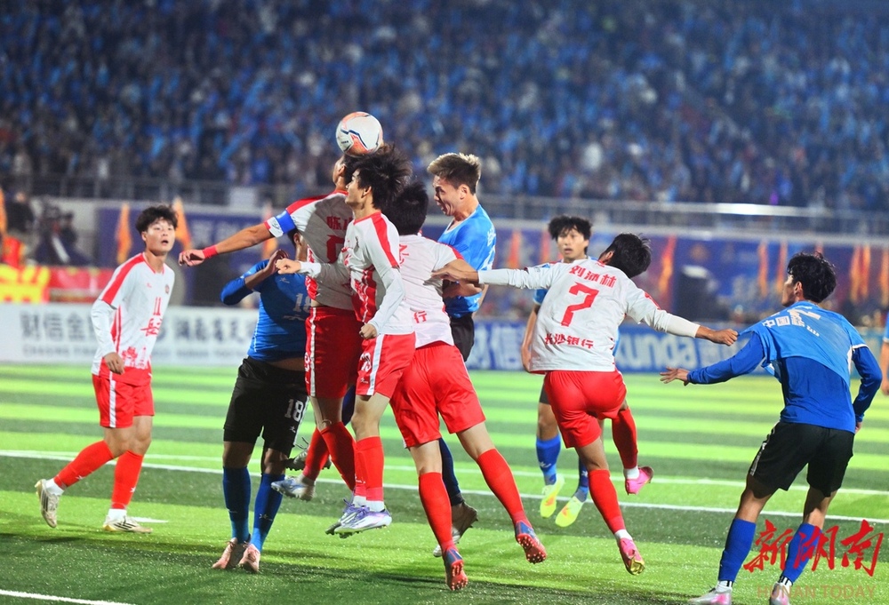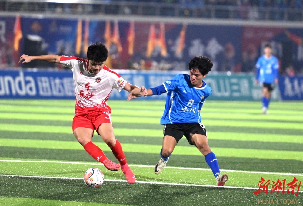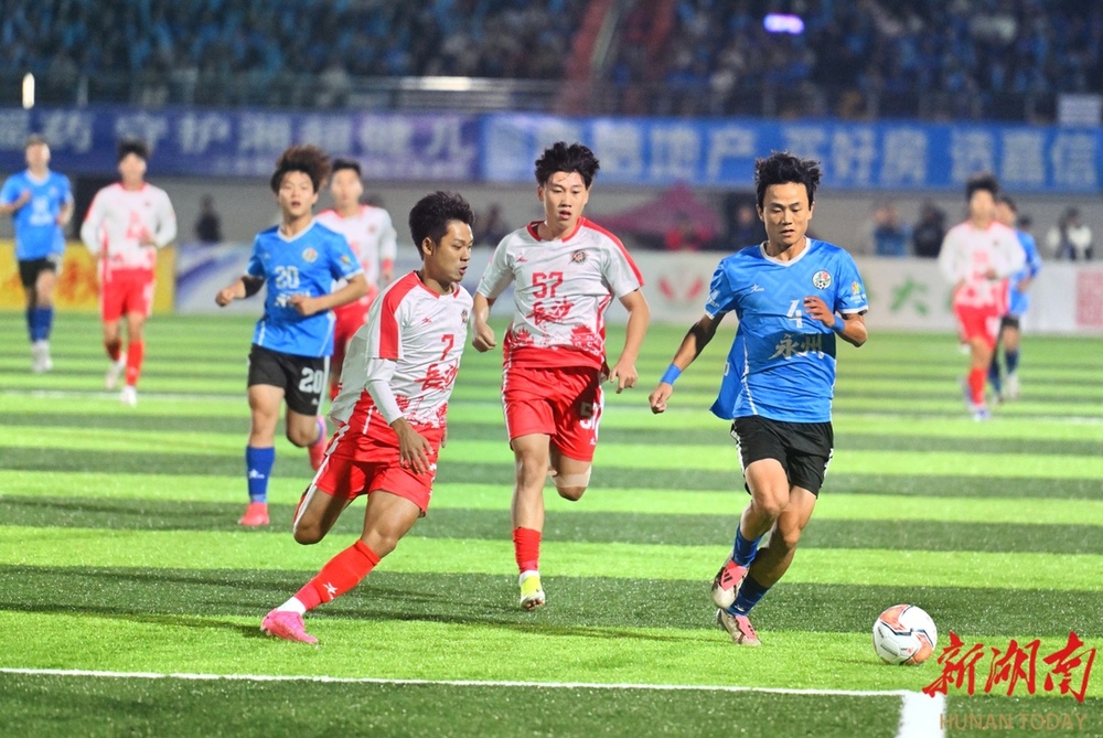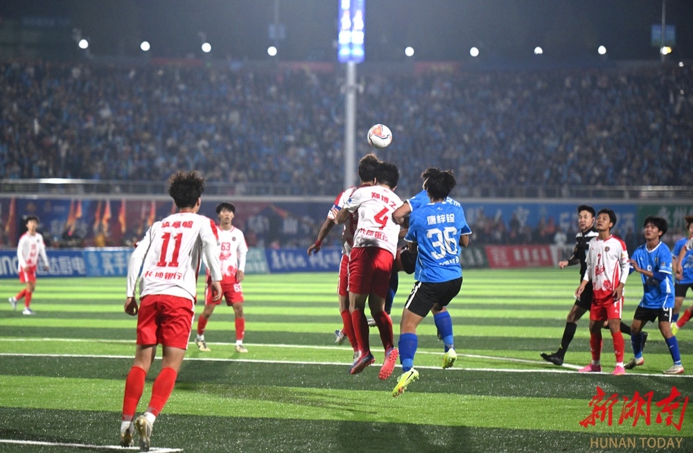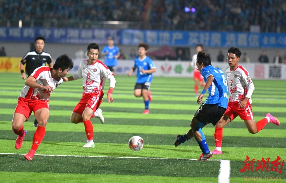 10月26日晚,双方球员在比赛中激烈对战。当晚,湘超联赛第七轮火热开战,永州队在永州体育场主场迎战长沙队,此场硬仗的热度备受关注。第9分钟,永州队先破长沙队球门,长沙队保持六轮的“金身”终于被打破。(湖南日报全媒体记者 郭立亮 摄)
