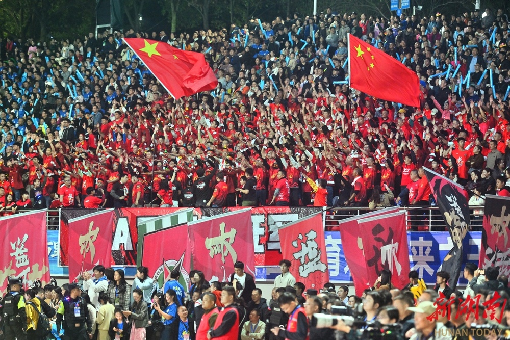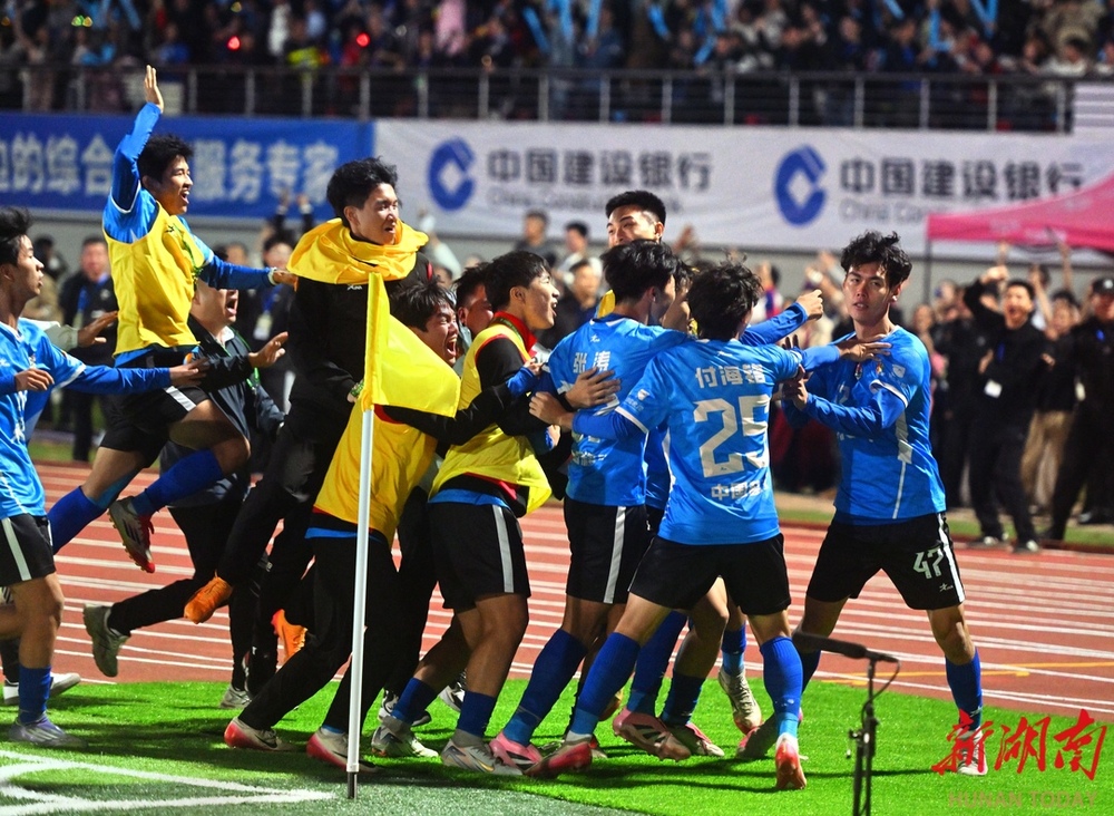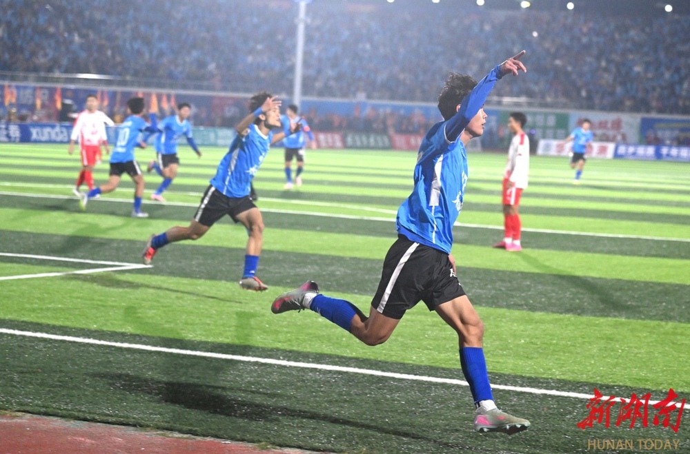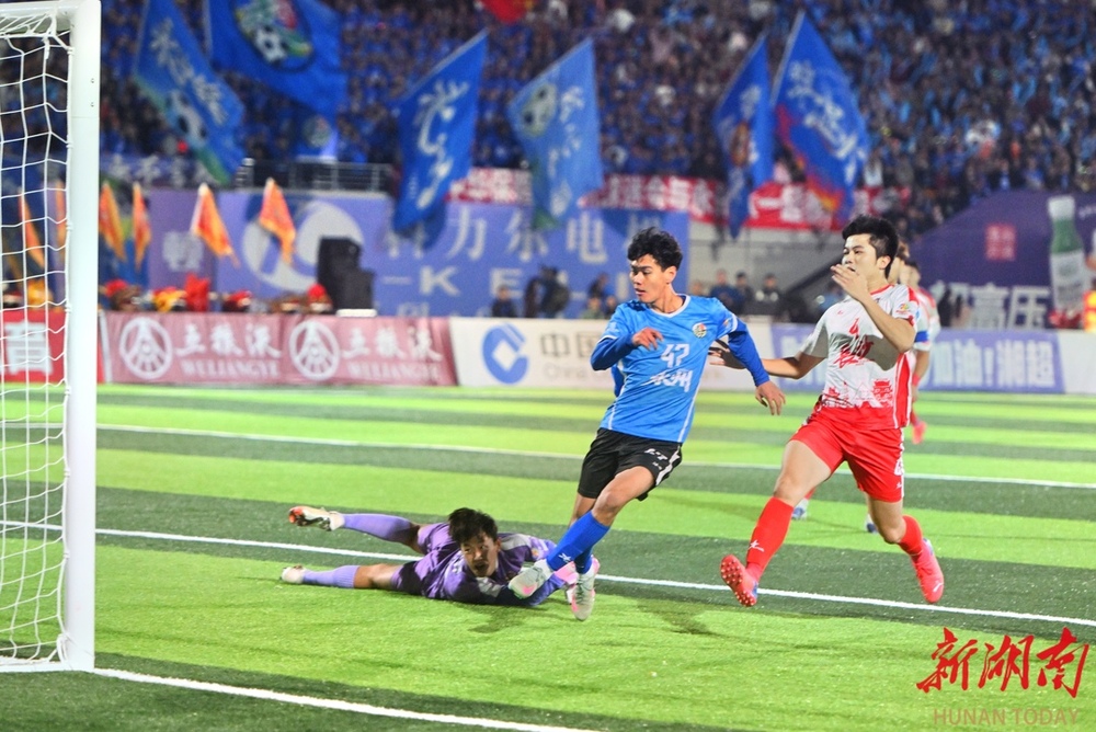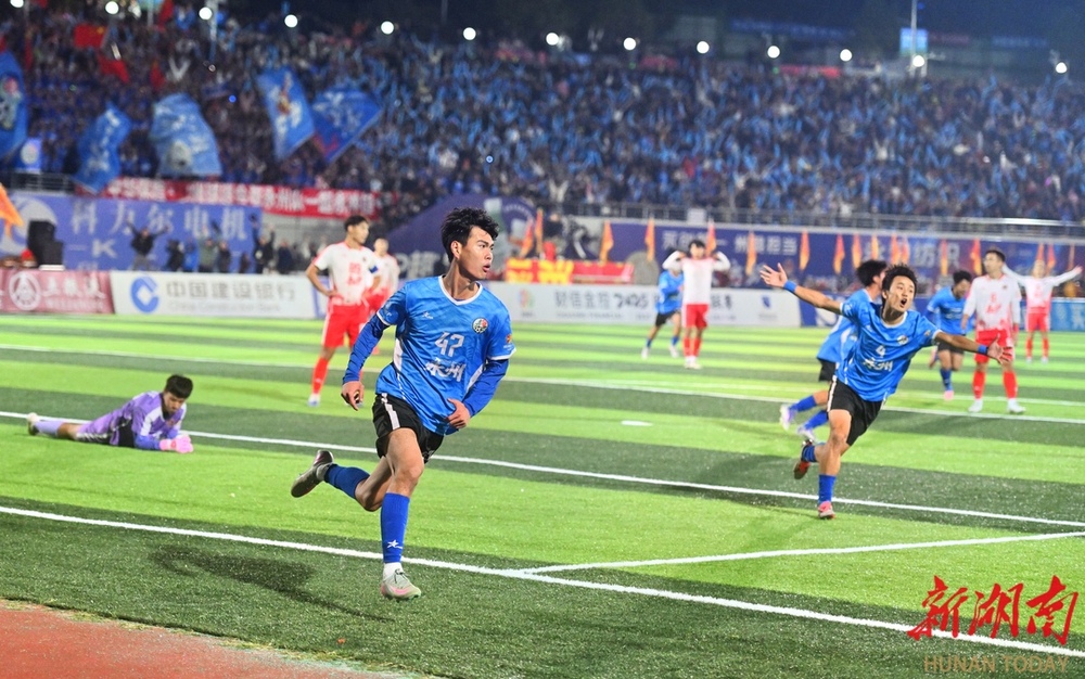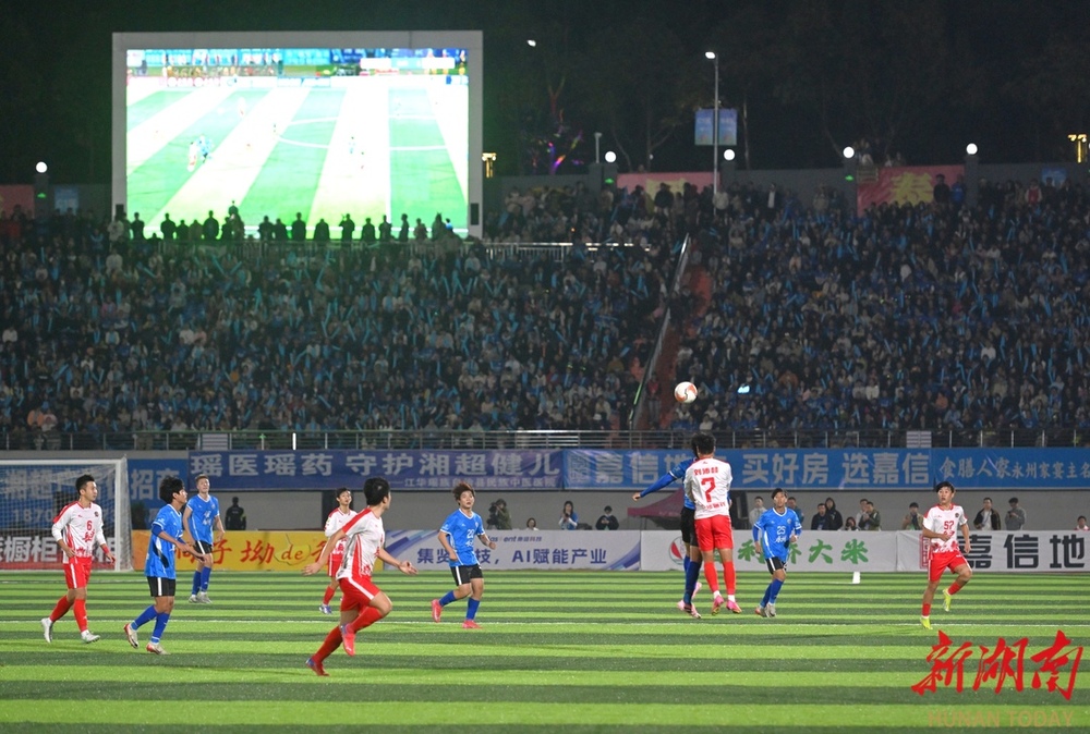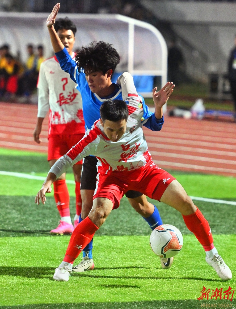 10月26日晚,双方球员在比赛中激烈对战。当晚,湘超联赛第七轮火热开战,永州队在永州体育场主场迎战长沙队,此场硬仗的热度备受关注。第9分钟,永州队先破长沙队球门,长沙队保持六轮的“金身”终于被打破。(湖南日报全媒体记者 郭立亮 摄)