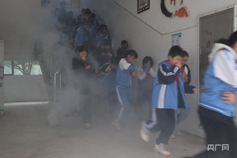 学生们低头、弯腰、捂住口鼻,有序撤离(央广网发 蒋彦斌 摄)