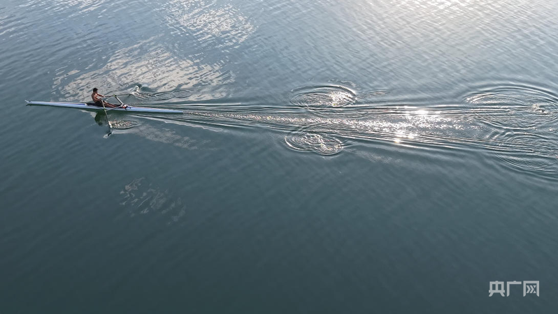训练中的皮划艇划破平静水面(央广网发 李秋燕 摄)