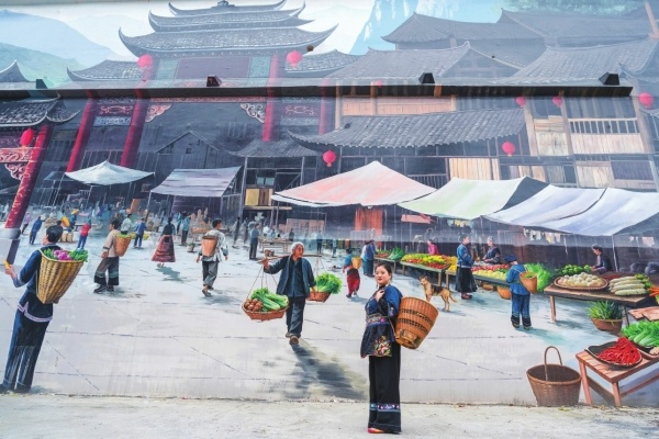 12月29日,吉首市矮寨镇矮寨社区,一幅幅展现苗族群众赶集的大型墙绘跃然墙上,生动再现了苗乡风情,吸引游客在此拍照打卡。这些精心创作的墙绘作品,既提升了村寨颜值,又让苗族文化以更鲜活的方式走进大众视野。