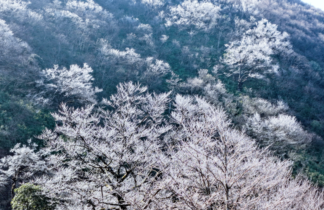 待到暖阳初升,气温回升,金色的阳光洒落山间,雾凇冰晶折射出璀璨光芒。蓝天为幕,白云作衬,银装素裹的山野愈发灵动,正应了“忽如一夜春风来,千树万树梨花开”的诗意景致。白色雾凇与转动的风车相映成趣,勾勒出瑶山冬日独有的生态画卷,让邂逅此景的游人沉醉流连。