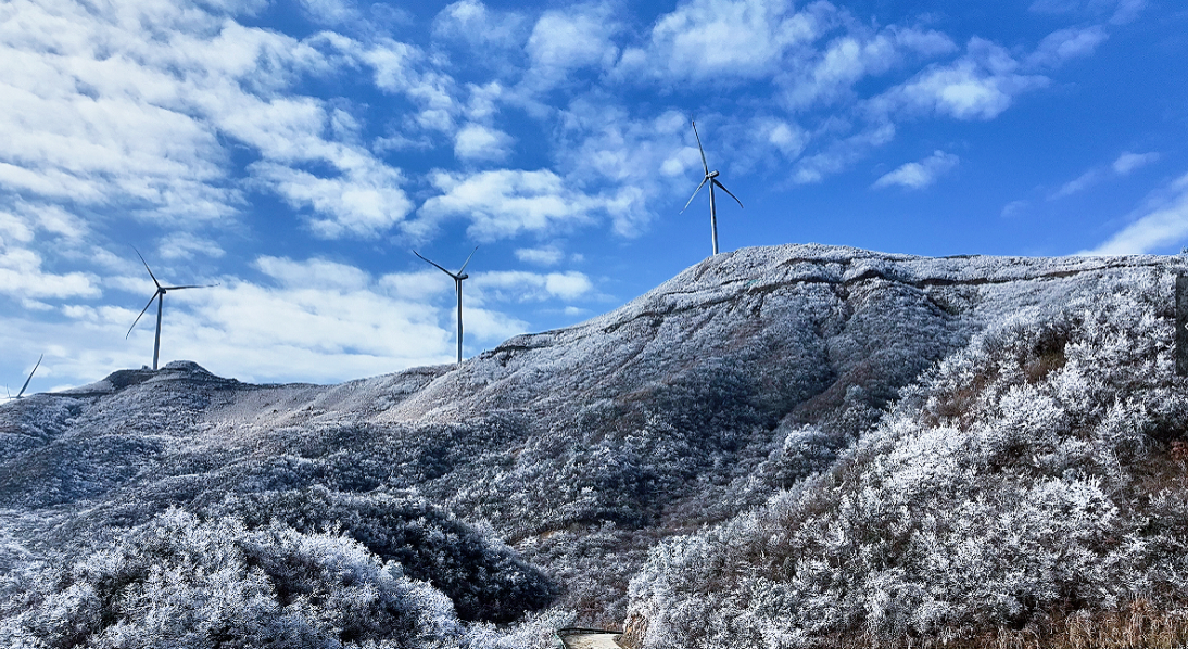 连日来,冷空气席卷湘西南群山,海拔1800余米的湖南省新宁县黄金瑶族乡风雨殿风电场,今冬首场雾凇悄然绽放,将瑶山之巅妆点成晶莹剔透的童话世界。