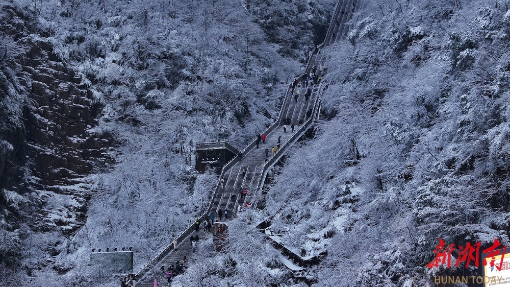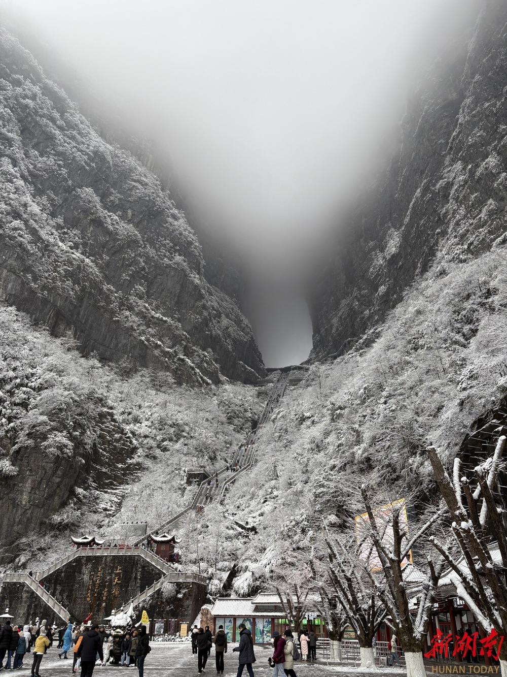 当日清晨,雪花纷纷扬扬洒落,天门山逐渐换上“纯白新装”。巍峨的天门洞在白雪映衬下更显雄奇壮阔,云雾缭绕间宛如仙境;悬空栈道被积雪覆盖,行走其上仿佛踏入“云端雪道”;成片的武陵松挂满冰晶,玉树琼枝相映成趣,每一处景致都如诗如画,吸引不少游客驻足拍照留念。“新年第一天就能在天门山看到这样的雪景,太幸运了!马年开篇就邂逅如此美景,感觉一整年都会有好运气。”来自湖南长沙的游客李女士兴奋地说。