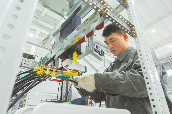 娄底经开区湖南星源电气有限公司,工人正在安装配电箱。吴永华 摄(湖南图片库)
