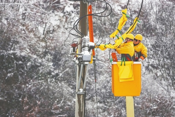 龙山县里耶镇八面山,国网龙山县供电公司员工顶风冒雪带电作业。田良东 唐荣沛摄(湖南图片库)