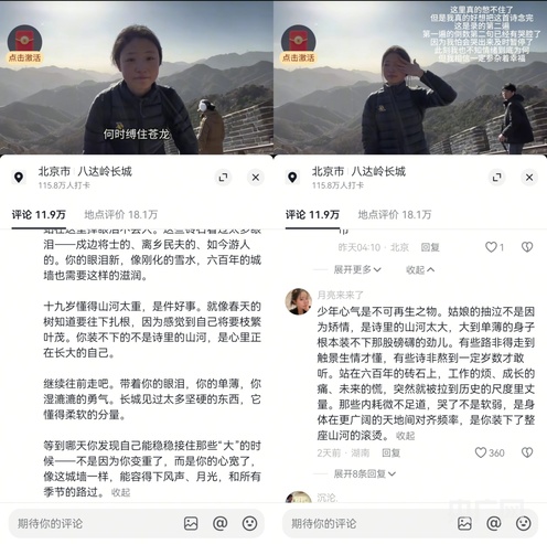 陈欣妍说,最终发布的视频其实是第二遍录制的,不仅有卡壳,中间还哽咽了,严格来说不够完美,但她自己觉得,当时的情绪很真实,很真挚,所以就勇敢地发布了出来:“画面或许有瑕疵,但情感是完整真挚的。”也正是视频里情到浓时的“不完美”,获得了过路游客的点赞,获得了网友的点赞,更让很多网友产生了情绪共鸣,纷纷留言。