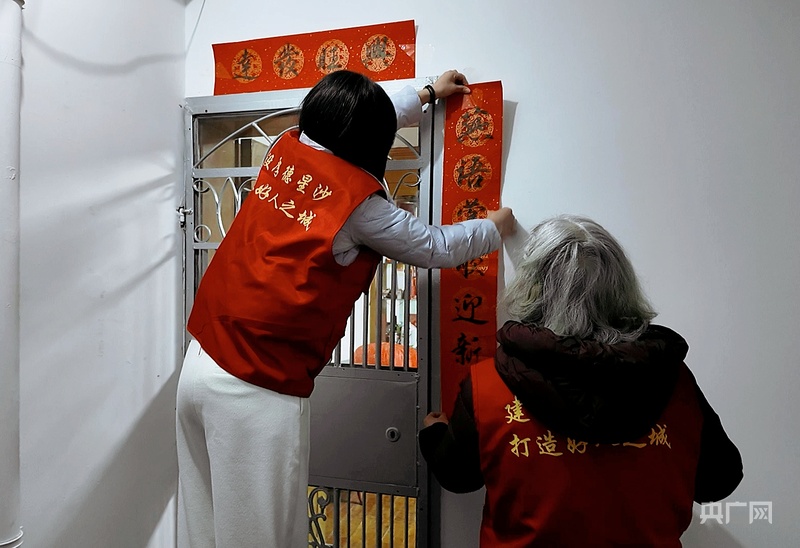 长沙泉塘街道阳高社区工作人员和志愿者为社区老人贴春联(央广网记者黄珂岚 摄)