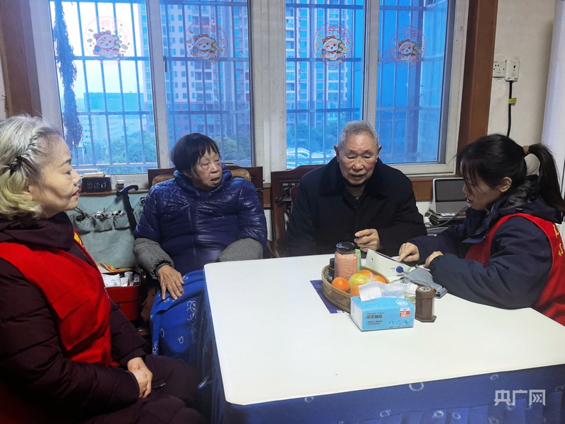 社区工作人员为老人测血压(央广网记者黄珂岚 摄)