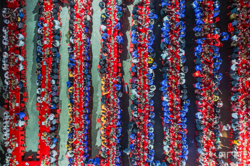 18时30分,百桌千人神龙宴准时开席。荷叶粉蒸肉、瑶家十八酿、瑶家腊肉等特色美食依次上桌,让现场村民和游客在品尝瑶家风味的同时,深切感受千人长桌宴的热闹氛围。长桌宴结束后,篝火晚会如期举行,熊熊篝火映照下,整个神岗村化作欢乐的海洋。