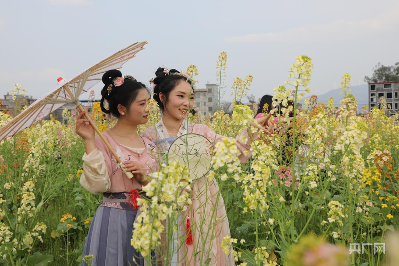 游客身着汉服,在油菜花田拍照打卡(央广网发 刘文斌 摄)