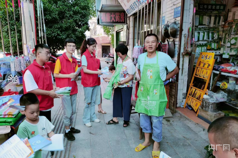 志愿者沿街向过往群众发放宣传资料(文广站 摄)