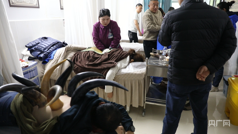 旅程的首站是江华民族中医医院。在这里,抽象的“非遗”化为可感的体验。游客们亲身体验了刮痧、拔火罐、火疗、针灸等传统技法。其中,瑶医特色的“颊针”疗法令人称奇——医生将极细的毫针精准刺入游客面颊部的穴位,可调理身体各部位不适;而“推蛋”疗法则用温热的熟蛋白加银币在体表滚动探查不适,充满生活巧思。