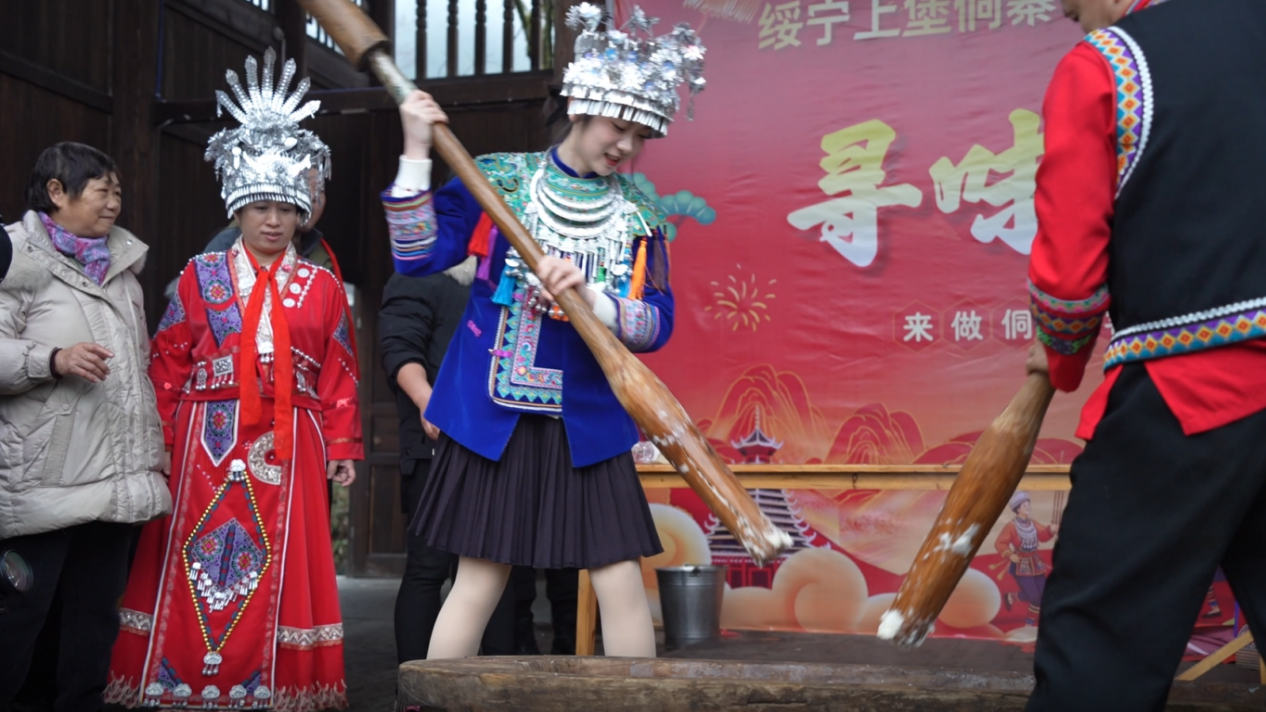 侗寨处处化身欢乐的海洋。鼓楼里,村民们忙着煮油茶,阵阵香气沁人心脾;鼓楼外,打糍粑的木槌声声作响,糯米被捶打成软糯的糍粑,杀年猪的欢腾声更添浓浓的年味儿。趣味十足的“媒婆逛寨”表演引得众人捧腹大笑,随手一拍都是网红打卡大片。