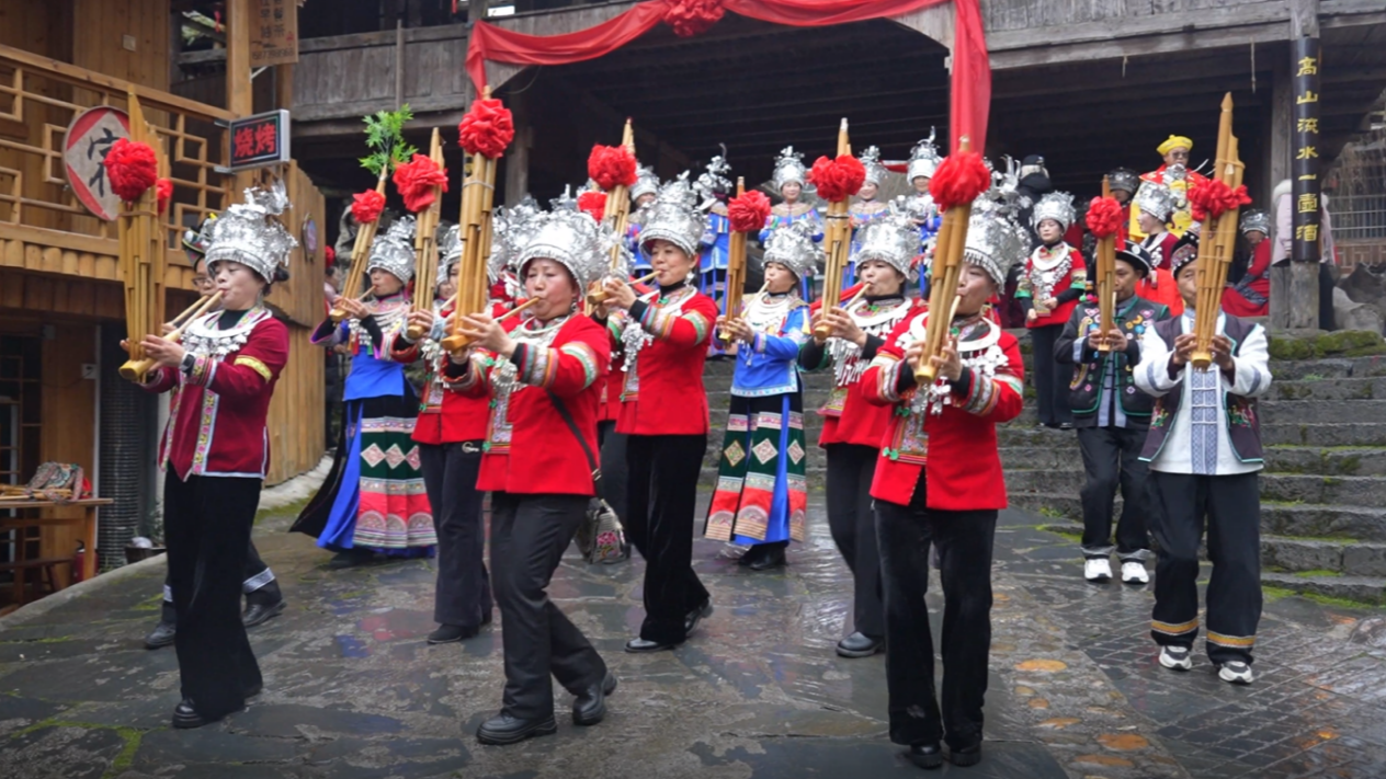 清晨的上堡侗寨云雾缭绕,青石板路蜿蜒通向寨门。身着盛装的侗族姑娘分列两侧,手持酒杯唱起迎客歌;十余位芦笙队员昂首伫立,竹质笙管在晨光中闪烁,雄浑悠扬的芦笙声穿越村寨,为远道而来的宾客送上最热烈的欢迎。游客们接过盛满糯米酒的酒杯,一饮而尽,脸上洋溢着藏不住的喜悦笑容。