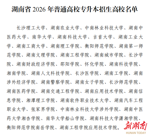 近日,湖南省教育厅正式印发《湖南省2026年普通高等学校专升本考试招生工作实施方案》(下称《方案》),明确2026年专升本招生将涵盖42所院校,设置普通计划、免试计划招生通道,同时为退役军人、脱贫家庭学生等群体提供专项保障,进一步完善专升本考试招生制度,畅通专科生升学路径。