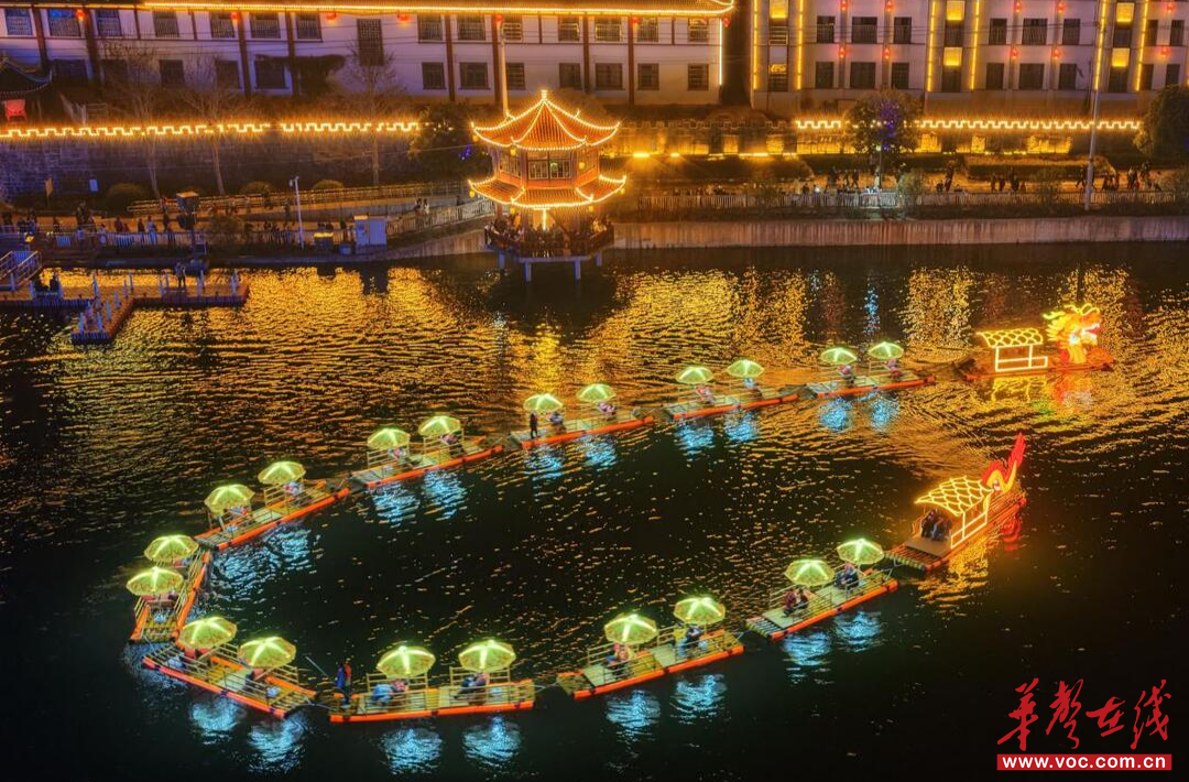 (城步苗族自治县巫水河县城段,载客电动竹筏悠然行驶于水面,宛如一条游弋的“金龙”,为游客带来别具风情的沿河观光体验。严钦龙 摄)