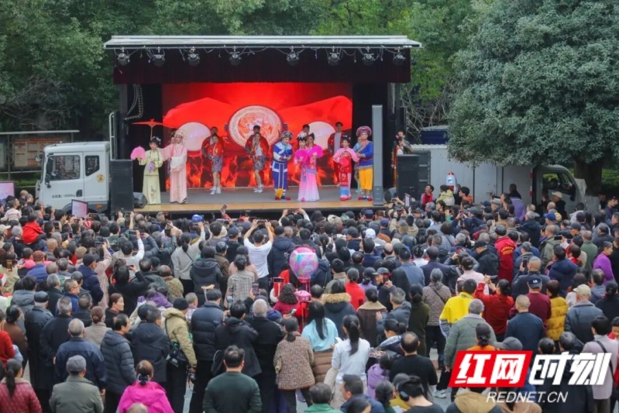 邵阳宝庆里历史文化街区的花鼓戏表演吸引了众多游客驻足观看。