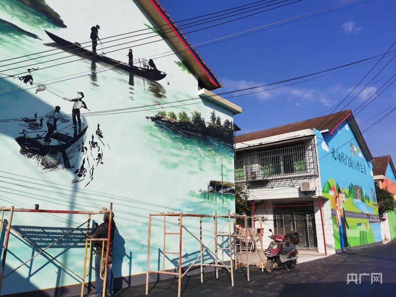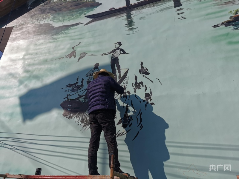 彩绘墙上描绘渔民美好生活。