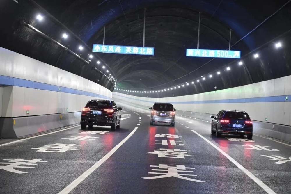 湘雅路隧道,全线配备了全透式主动发光标志。