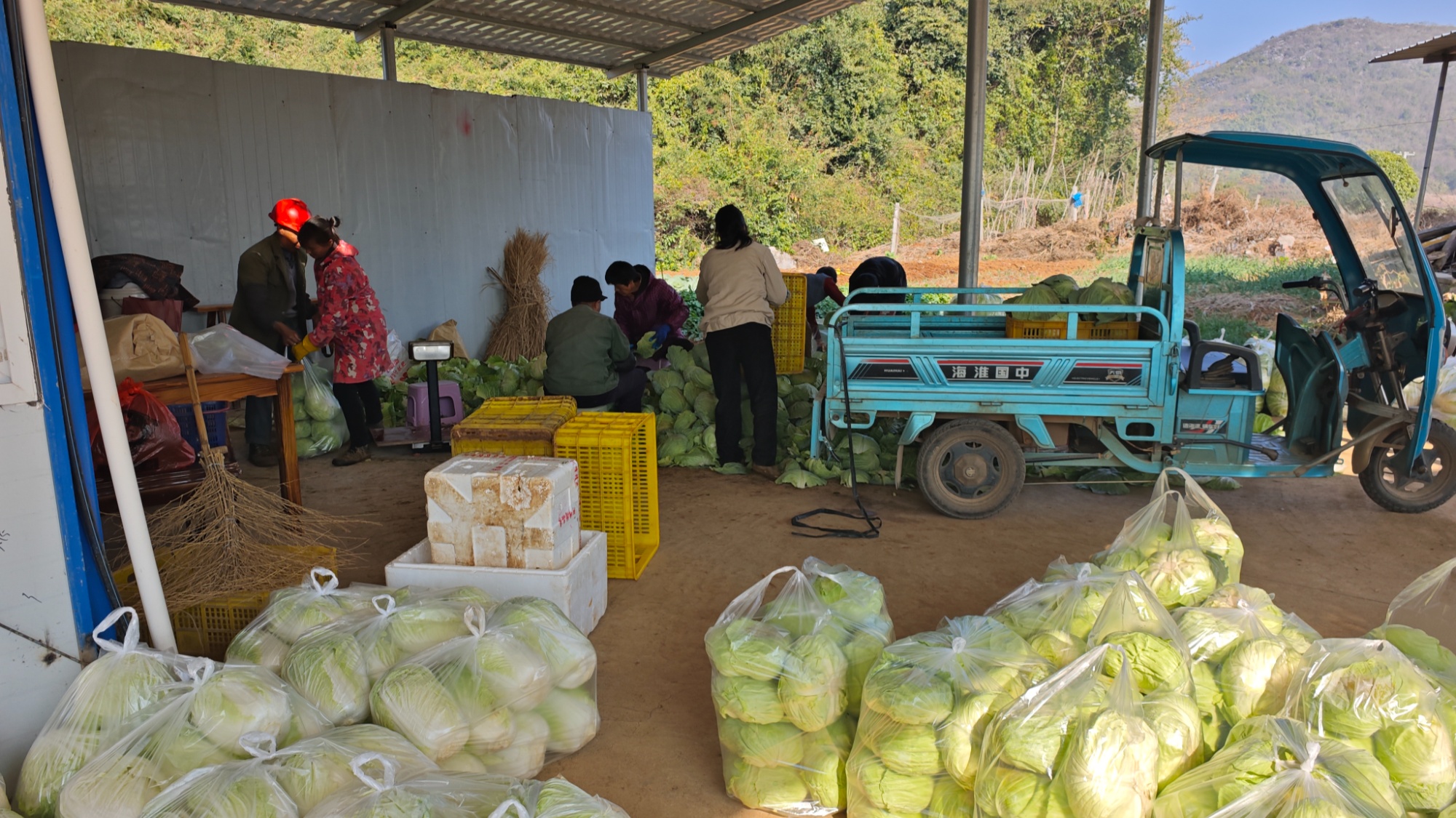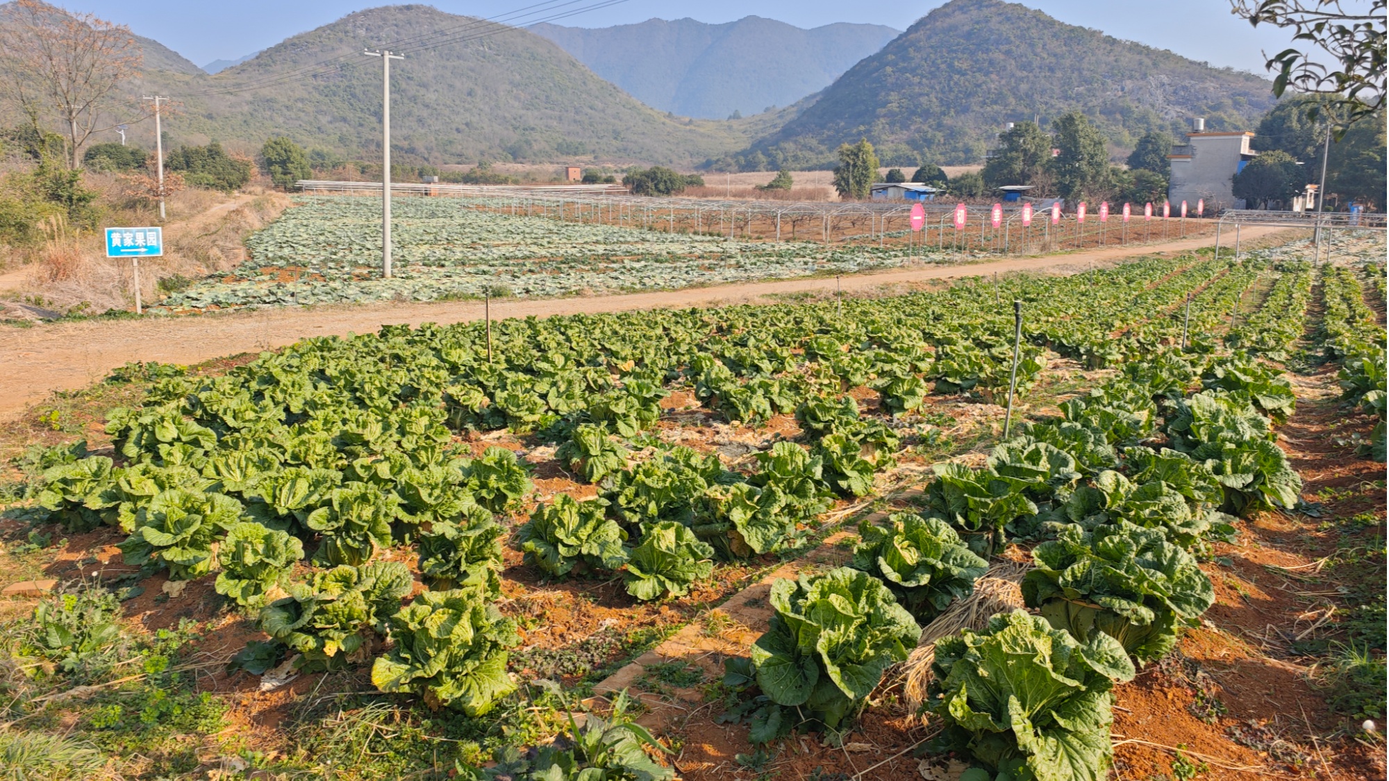 冬日暖阳洒在连片的钢架大棚上,泛着银色的光;棚内,绿油油的秧苗整齐列队,孕育着丰收的希望;旁边的菜园中,一排排大白菜生长得格外茁壮,叶片肥厚而翠绿,工人们在田间穿梭,整理、打包,准备运往市场。