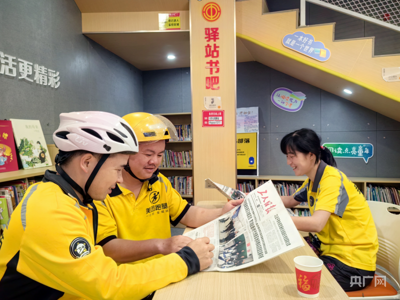 骑手吴兵(左二)、陈妻玲(右一)夫妇,张清敏(左一)正在驿站看报(央广网发 泉塘街道 供图)
