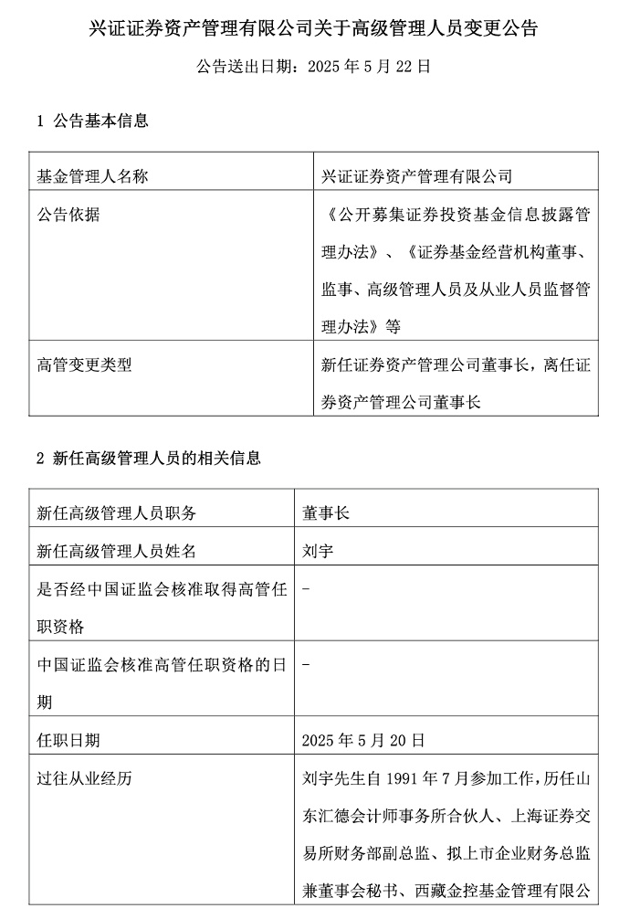 根据公告,刘宇自2025年5月20日起任兴证资管党委书记、董事长。资料显示,刘宇曾任山东汇德会计师事务所合伙人、上海证券交易所财务部副总监、西藏金控基金管理有限公司总经理等职务,具有丰富的金融行业从业经历。2019年2月至此次调整前,一直担任兴证投资管理有限公司执行董事兼总裁。