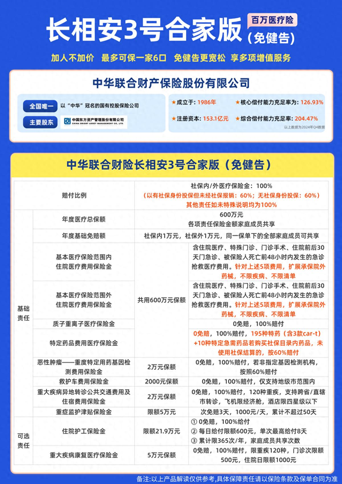 基于多年意健险领域的专业积淀,中华财险精准洞察家庭保障需求,携手国内领先的保险产品和服务专业平台慧择保险,推出“长相安 3 号合家版(免健告)”,一张保单能保全家,重新定义家庭健康保障。