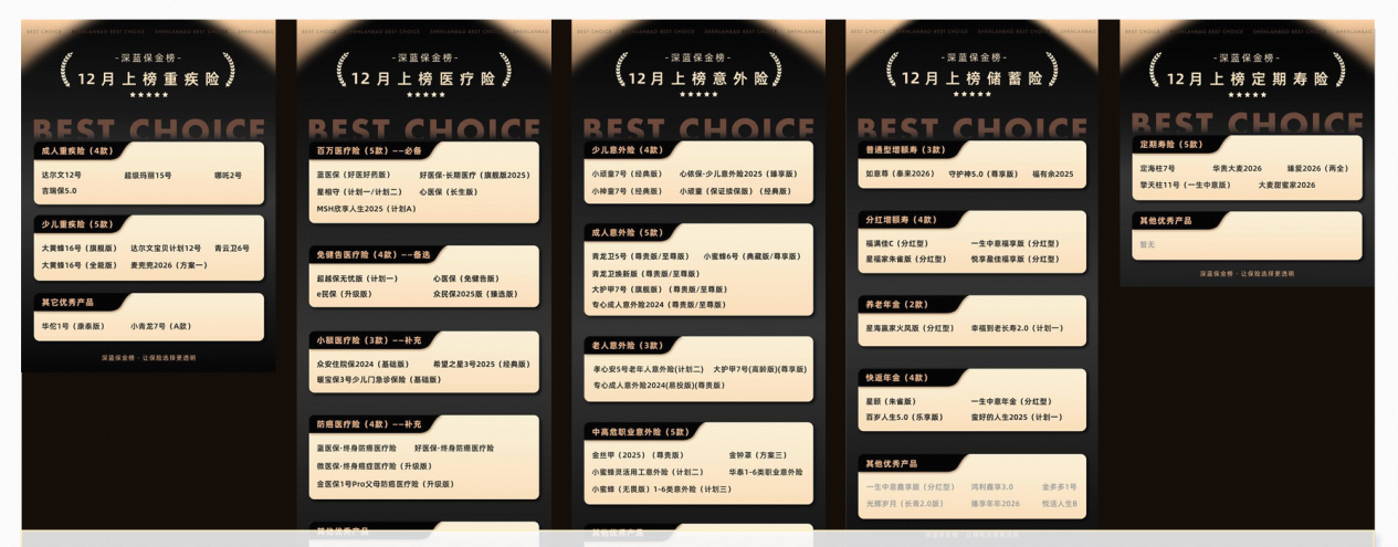 在此背景下,以深蓝保为代表的第三方保险测评为用户决策提供了重要参考。以2025年12月为例,深蓝保测评了市面上各大机构的产品,最终挑选出每个类型下3-5款优选产品,形成深蓝保金榜榜单。