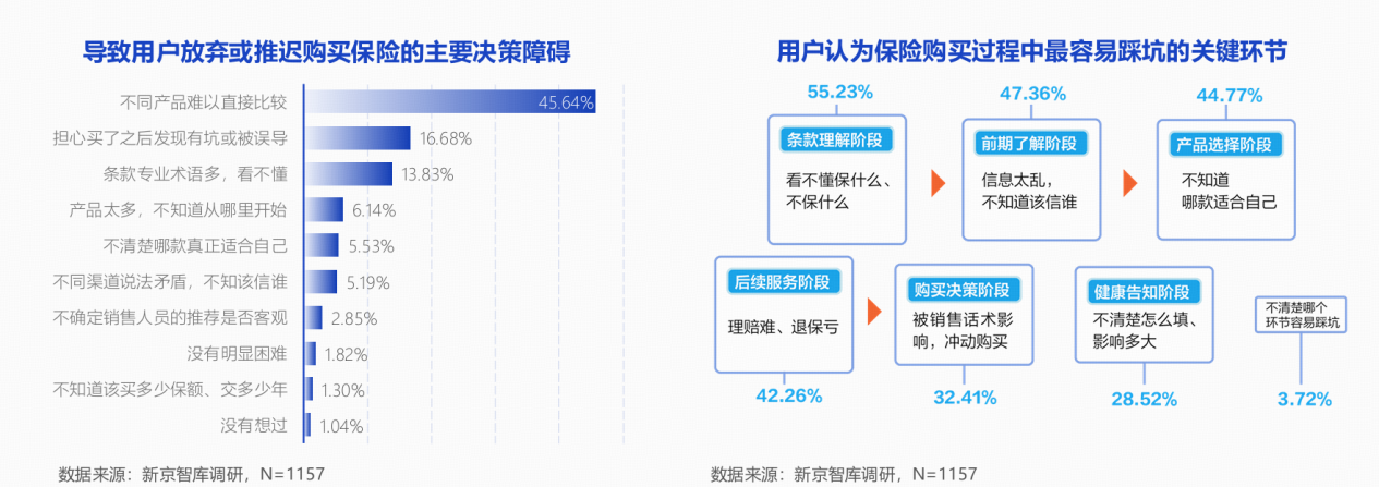 决策困境的另一根源在于信息处理层面——用户并非“不想买”,而是“不会选”。报告显示,45.64%的用户将“不同产品难以直接比较”列为放弃或推迟购买的首要原因,这一比例是第二名的近三倍,远超保费价格等其他因素。