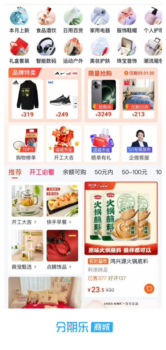 消费热度回升之际,如何更好地满足消费者合理消费需求,助力消费热情稳步释放,成为检验企业服务能力的重要标尺。作为国内首家线上分期购物商城,分期乐商城长期聚焦年轻用户消费需求,成立十余年来,商城充分发挥场景优势与分期特色,在商户引进和品类运营上重点打造潮流分期体验,帮助年轻人降低购买门槛,灵活分期、轻松消费。为更好地服务民生消费,近期分期乐商城先后推出双十二年终盛典、年货节、春节不打烊、百亿贴息等活动,在保障品质商品供给和履约能力的基础上,通过官方贴息、优惠叠加等方式,最大程度地让利用户,提升用户体验,助力消费热情稳步释放。